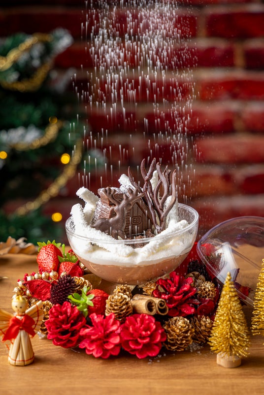 スノードームショコラプレミアムプラン限定!目の前で粉砂糖をふりかけ仕上げる演出をお楽しみいただけます。濃厚なチョコレートムースに、キュートなサンタクロースの工房をイメージしたチョコレートを添えてご提供いたします。
