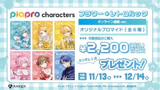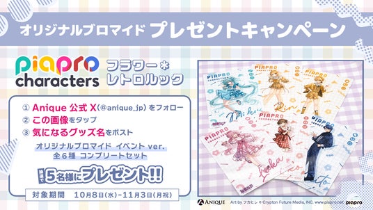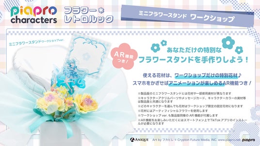 Anique株式会社(本社:東京都千代田区、代表取締役:笠井高秀)は、『ピアプロキャラクターズ』よ り、【フラワー*レトロルック】をテーマにした新規描き下ろしイラスト使用のカラフルなオリジナルグ ッズと、体験型ワークショップを楽しめるPOP UP SHOPを開催いたします。