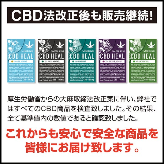 厚生労働省より提出された大麻取締法改正案に伴い、弊社の人気商品CBD HEAL The Third IZUMIも検査機関での検査を行いました。その結果、CBD HEAL The Third IZUMIには規制の影響がないことが分かりました!