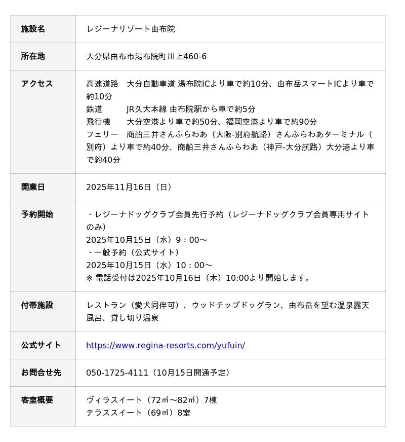 東京建物株式会社のグループ会社である東京建物リゾート株式会社は、愛犬同伴型ラグジュアリーリゾートホテル「レジーナリゾート」シリーズとして九州初となる「レジーナリゾート由布院」の開業日が2025年11月16日(日)に決定しましたのでお知らせします。また、開業に先立ち10月15日(水)より宿泊予約受付を開始します。