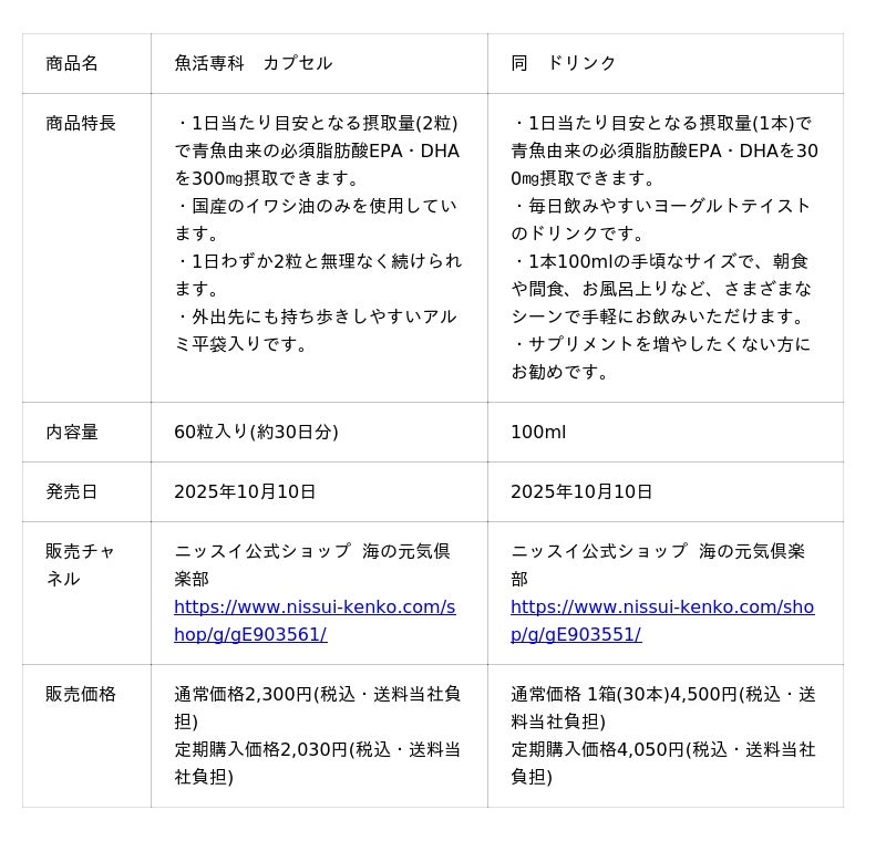株式会社ニッスイ(代表取締役 社長執行役員 田中 輝、東京都港区)は、日々の食生活で不足しがちな栄養素であるEPA・DHAが手軽に摂れる健康食品「魚活専科(うおかつせんか) カプセル」「同 ドリンク」の2品を、ニッスイ通販の公式ショップ限定で10月10日より新発売します。