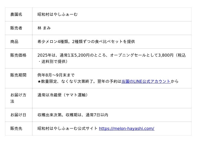 群馬県の「昭和村はやしふぁーむ」(代表:林まみ)は、スーパーや百貨店でめったに出会えない希少メロン4品種を育て、2025年から、日本初となる"食べ比べ通販"に挑戦、反響をいただいています。