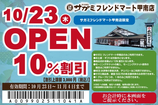 また、サガミフレンドマート甲南店限定でご利用いただける割引券を記載いたしました。この画面を掲示で期間中、何度でもご利用いただけます。