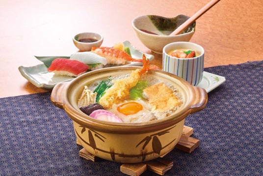 <なべ焼うどんと寿司セット> 毎日欠かさず「朝・夕」と取る出汁で仕上げた、サガミ自慢のだしで煮込んだ熱々のなべ焼うどんと、新鮮なネタを使用した寿司と茶碗蒸しを組み合わせた、今の季節にぴったりの贅沢なセットメニューです。