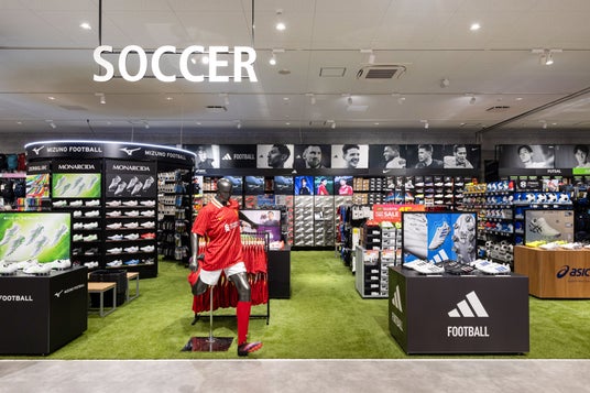 サッカーコーナーは、ミズノ、アシックス、ナイキ、アディダス、プーマなどの人気ブランドを中心に展開。ジュニアシューズも16cmから展開と充実しており、成長期のお子様の足に負担をかけないフィット感抜群のシューズをお選びいただけます。ウェアはアスレタ、アンブロ、プーマなどを中心に、部活生からジュニアまで幅広く対応。さらにタビオの高機能ストッキングなど、細部までこだわったアイテムもご用意しております。