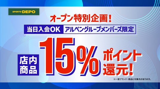 オープンを記念して10月24日(金)~11月4日(火)の期間、オープン特別奉仕品のご用意に加え、スポーツデポ ステラタウン大宮店にて店内商品お買上げでアルペンポイント15%還元を実施いたします。