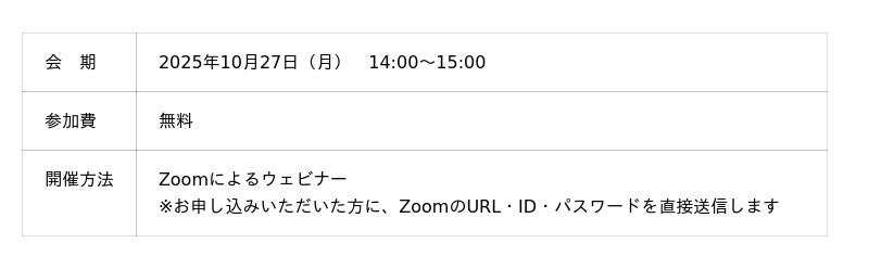 参加特典: ウェビナー参加後、アンケートで希望された方を対象に「セミナー資料(一部抜粋)」をお渡しします