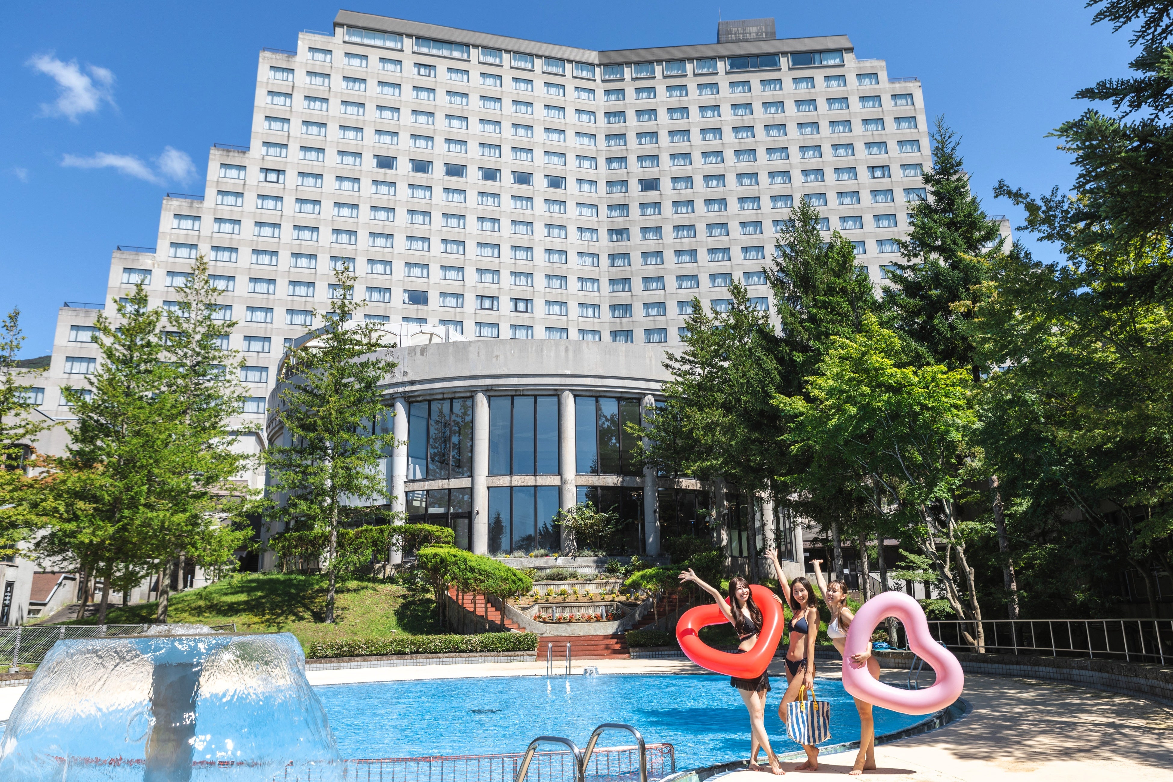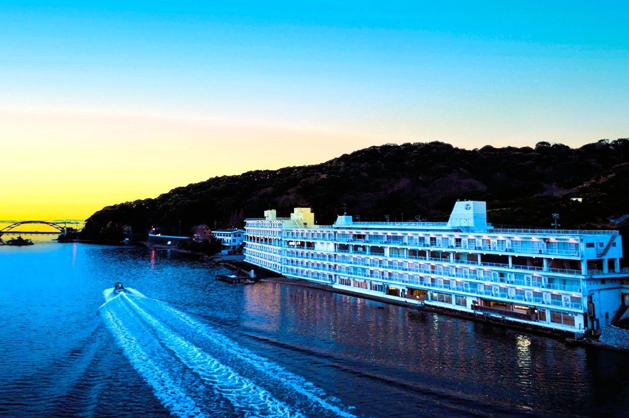 客船のような外観。夏季は屋上のスカイプールがオープン
