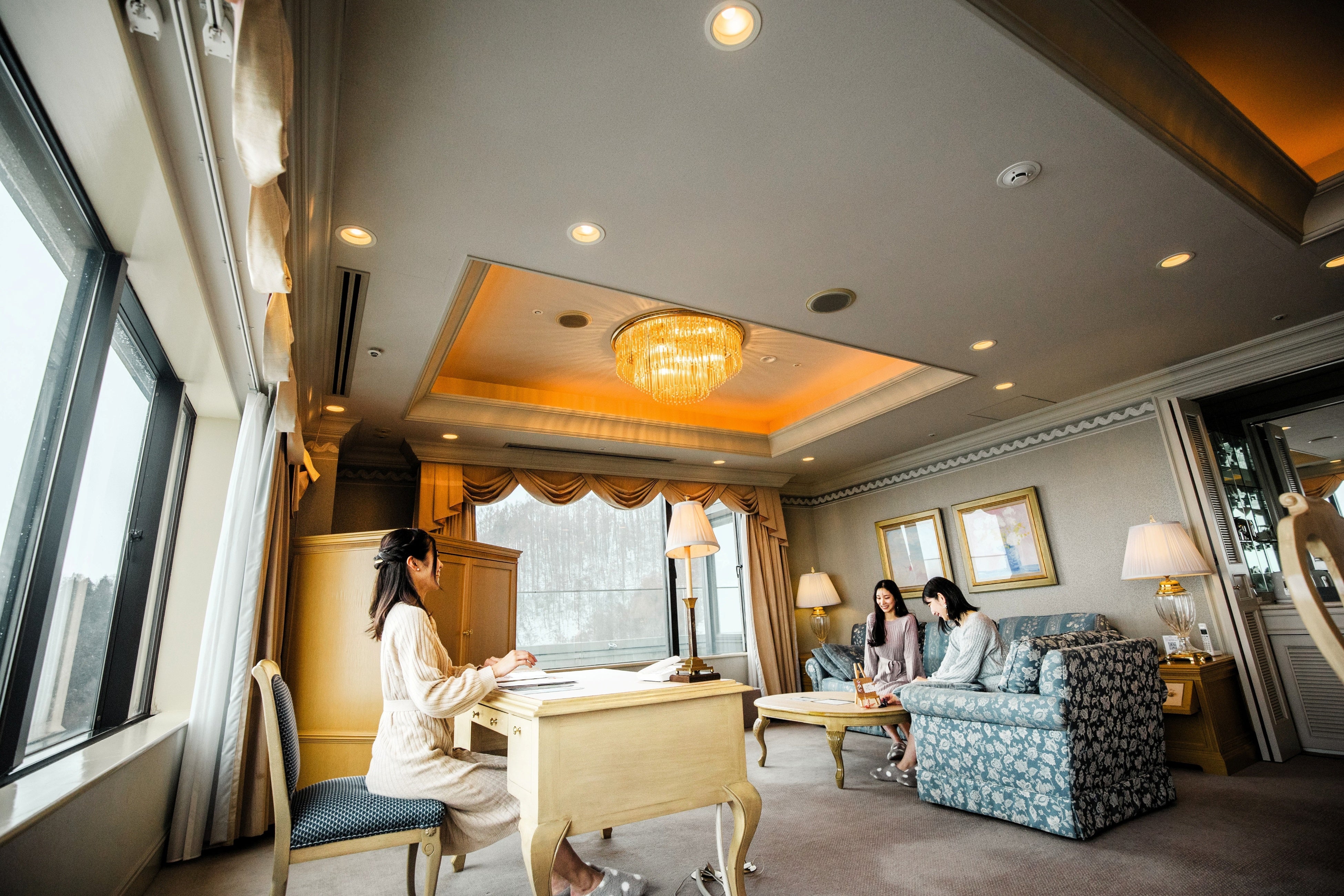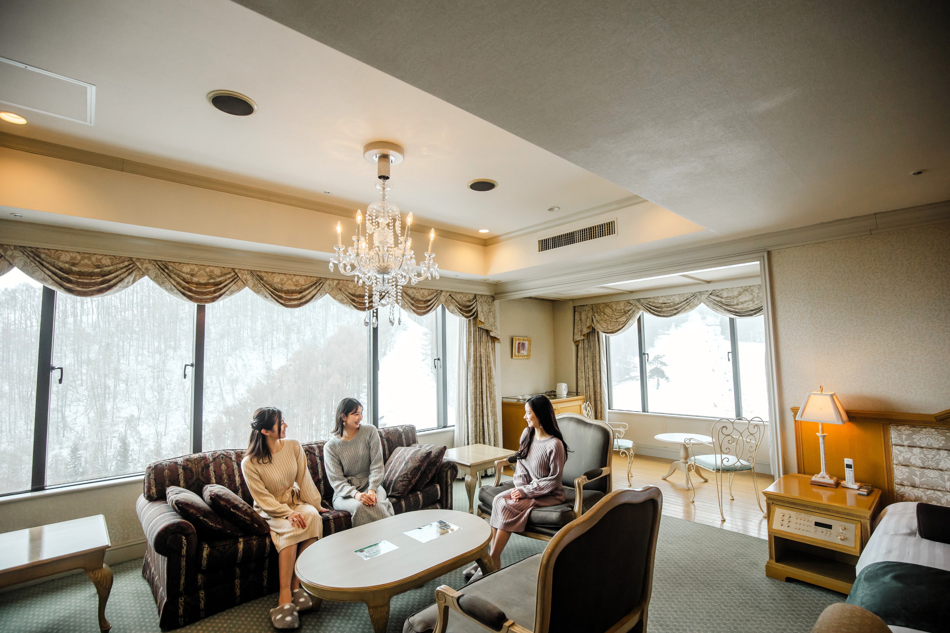 猪苗代湖とリステル スキーファンタジアを臨む最上階エグゼクティブフロアにあり、リビングやベッドルームのほか屋外テラスやジェットバス、専用アメニティーが揃います(定員2名)