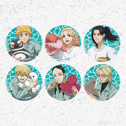 登場する6人のキャラクターイラストは、このイベントのために描き下ろされたもので、実際に水族館で販売されている海のいきもののぬいぐるみを抱えたデザインになっています。館内ショップでは『東京リベンジャーズ』のキャラクターたちが持っているアイテムと同じ商品をお買い求めいただくことも可能です。