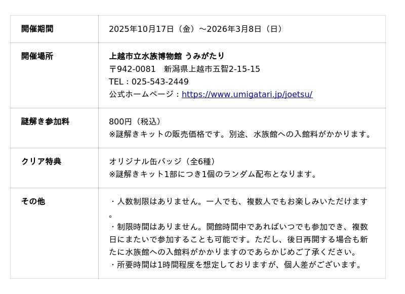 このイベントは、水族館を舞台に謎解きに挑戦する体験型のイベントで、新潟県上越市の「上越市立水族博物館 うみがたり」を皮切りに全国のさまざまな水族館での開催を目指しています。