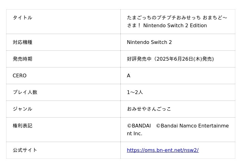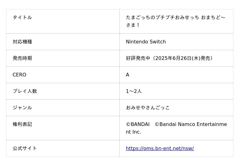 Nintendo Switch向けソフト「たまごっちのプチプチおみせっち おまちど~さま!」と、Nintendo Switch 2 向けソフト「たまごっちのプチプチおみせっち おまちど~さま! Nintendo Switch 2 Edtition」がそれぞれパッケージ版・ダウンロード版ともに現在好評発売中となります。