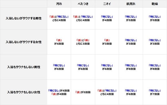 【入浴状況×サウナ利用状況×性別】別でみると、「汚れ」「べたつき」で気になる部位について、入浴もサウナもしない男性層を除き、頭が多い回答となった。