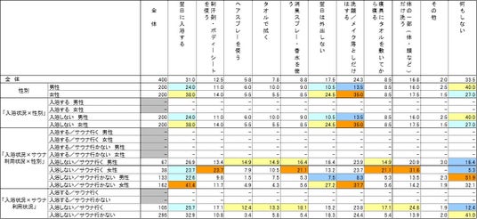 【入浴状況×サウナ利用状況×性別】別でみると、「何もしない」について入浴もサウナもしない男性層で、5割いたが、入浴もサウナもしない女性層では、3割強と約20ptの差があった。