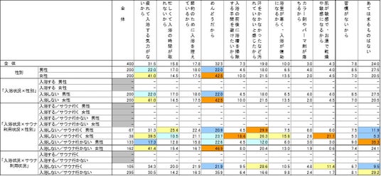 【入浴状況×サウナ利用状況】別でみると、入浴しないがサウナする層では、「めんどうだから」が2割程度と入浴もサウナもしない層と比較して14ptの差があった。