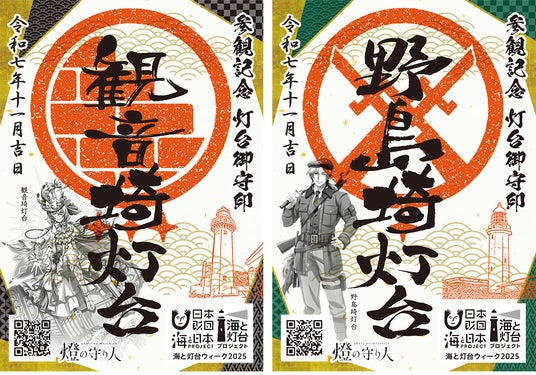 日本財団「海と灯台プロジェクト」を運営する一般社団法人海洋文化創造フォーラムは、この度、プロジェクトとして初となる「灯台御守印(とうだいごしゅいん)」を作成。2025年11月1日~8日の「海と灯台ウィーク」期間中、日本第1号の西洋式灯台である観音埼灯台(神奈川県)と同第2号の野島埼灯台(千葉県)にて、参観された方にお渡しします。