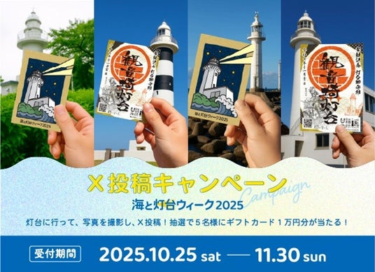 この「灯台御守印」と灯台の写真を撮影し、X投稿いただくと、抽選で5名様にギフトカード1万円分が当たるキャンペーンを開催します。「灯台御守印」をゲットした方はぜひ、ご応募ください。