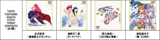 物販購入特典として3,000円(税込)ご購入ごとにランダムでプレゼントしている複製ミニ色紙は、「北爪宏幸(機動戦士Ζガンダム)」、「細野不二彦(ダーティペア)」、「阿久津潤一(GEAR戦士電童)」、「西田亜沙子(舞-乙HiME)」の4名による、新規描き下ろしイラストをデザインした、サンライズワールドでしか手に入らないオリジナル特典です。