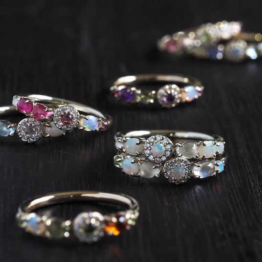 今月の主役は、10月の誕生石のひとつでもあるブラックオパール。深い地色に神秘的な模様を浮かべたその石は、約1cmほどの小さな世界に、夜空や銀河を閉じ込めたような奥行きを感じさせます。艶やかな表面からこぼれる遊色のきらめきは、唯一無二の存在感を放ちます。