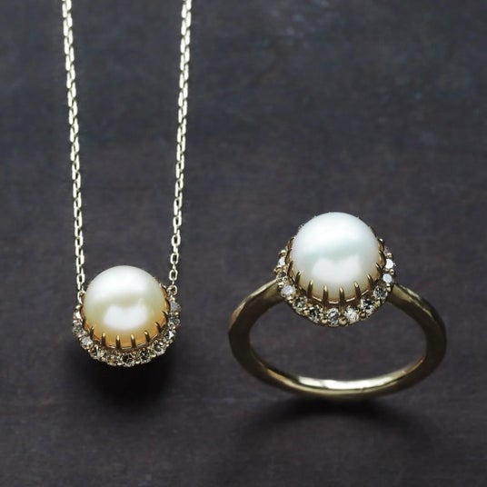 センターストーンをメレストーンで取り巻いたクラシカルなデザインが、真珠の柔らかな光を一層引き立てます。染色や色調補正を一切行っていない自然のままの真珠には、さまざまな光が繊細に浮かび上がります。真珠を少しだけ枠に沈め、厚みを与えることで、指あたりの良い仕上がりとなっています。フォーマルな場面はもちろん、カジュアルな装いにも馴染む愛らしさがポイントです。