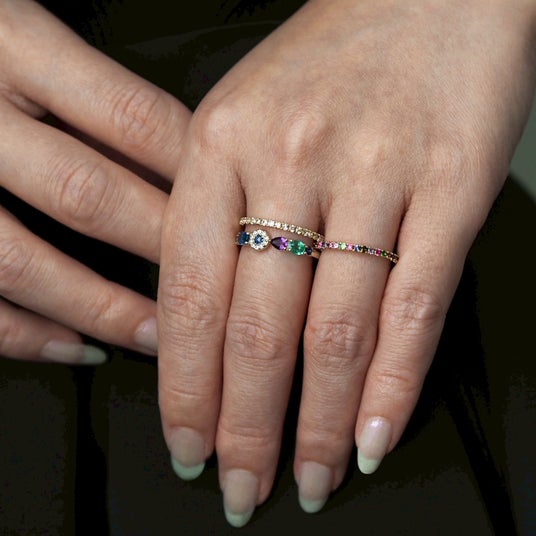 職人による繊細なパヴェが印象的なMiraは、リングの両サイドに施された石留めが、宝石がこぼれ落ちるような輝きを演出します。これまでCaravanやPOP UP SHOP限定で展開していたシリーズが、今回は2種類の幅感と襲色目のグラデーション配色で登場します。