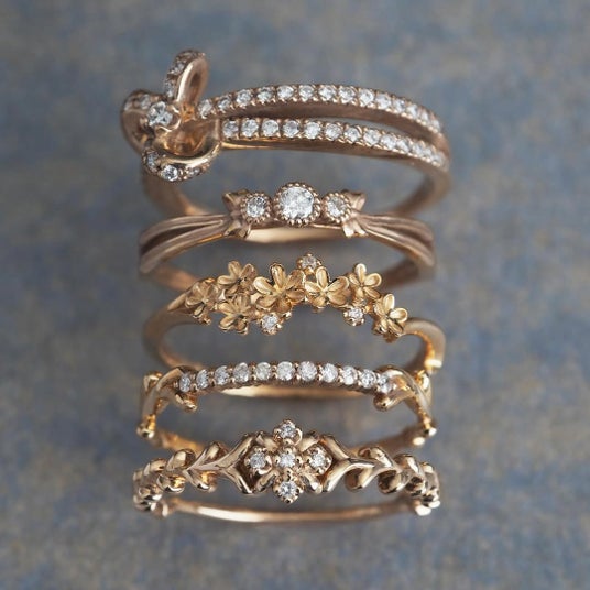 フランス語で「いちご」を意味するLa fraiseは、本物の花のような立体感と、手打ちのミルグレインが描くクラシカルな佇まいが特徴です。今回は、ローズカットの石を留めた配色も登場。可憐で愛らしい表情が指先を彩ります。
