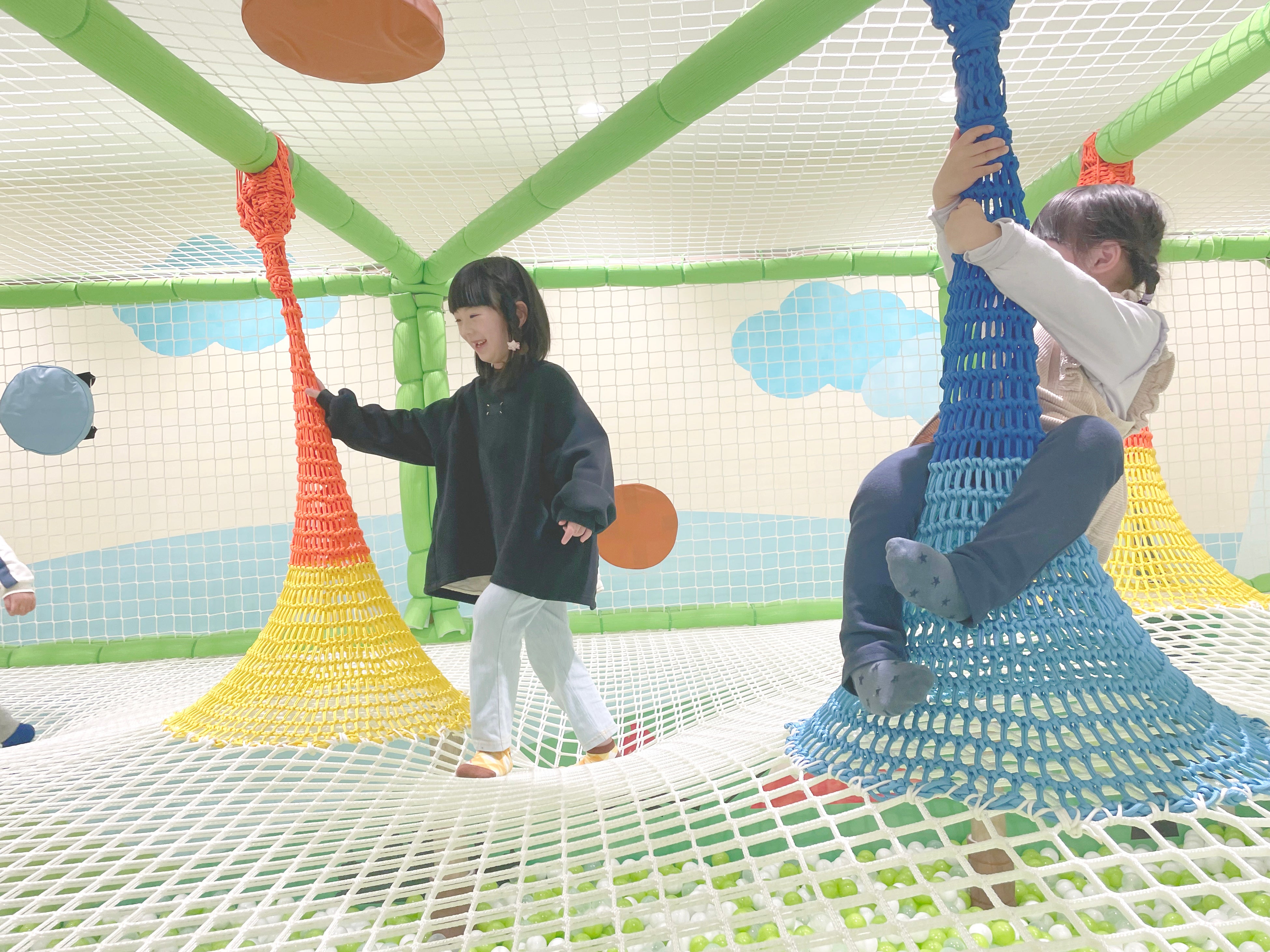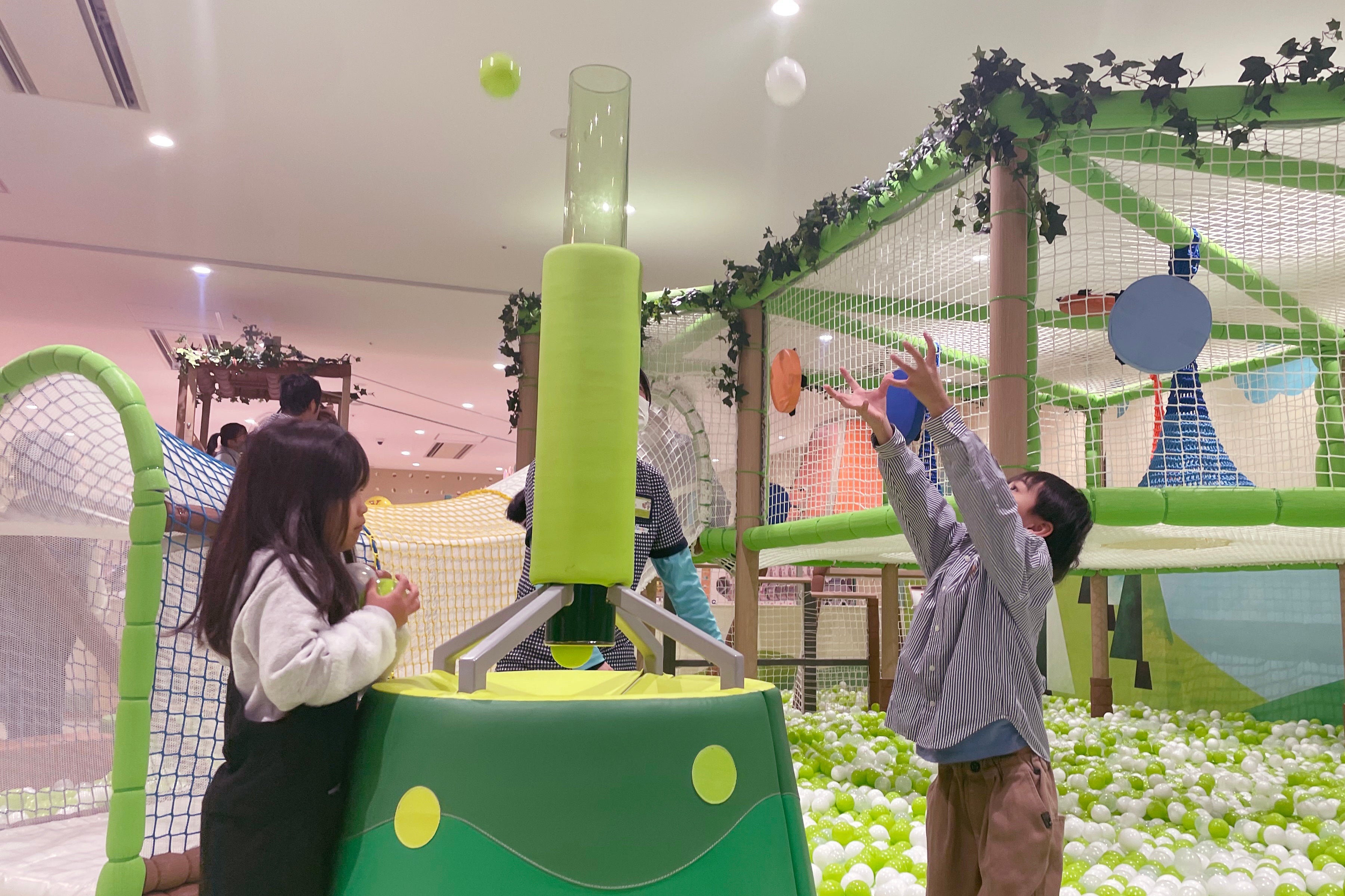人気のボールプールにはボールを天に向かって飛ばす遊具「のびキャノン」も。