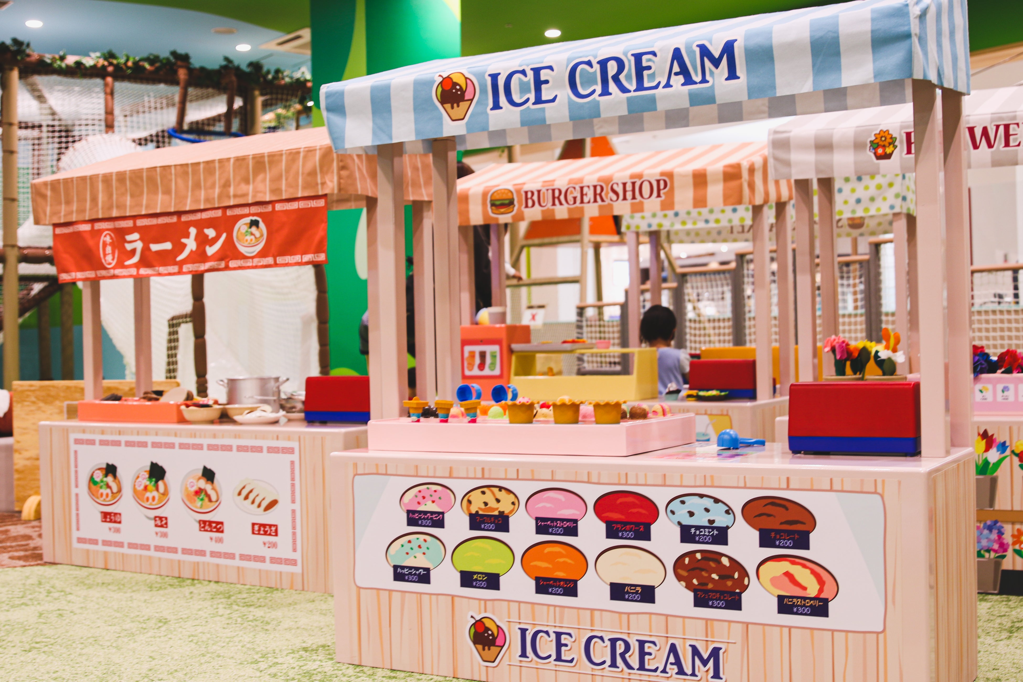 お花屋さんやハンバーガーやさんなど想像力を育む6種類のごっこあそびができるコーナー。