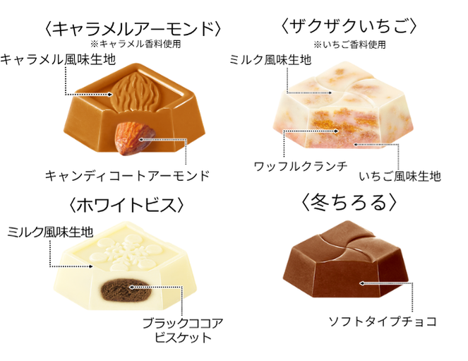 新フレーバーの<キャラメルアーモンド>、ワッフルクランチの食感がたまらない<ザクザクいちご>、優しいミルクの甘みとサクッと食感の<ホワイトビス>、チロルチョコファンから長年愛されるまろやかなくちどけが特徴の<冬ちろる>の全4種が楽しめるお得なパック!