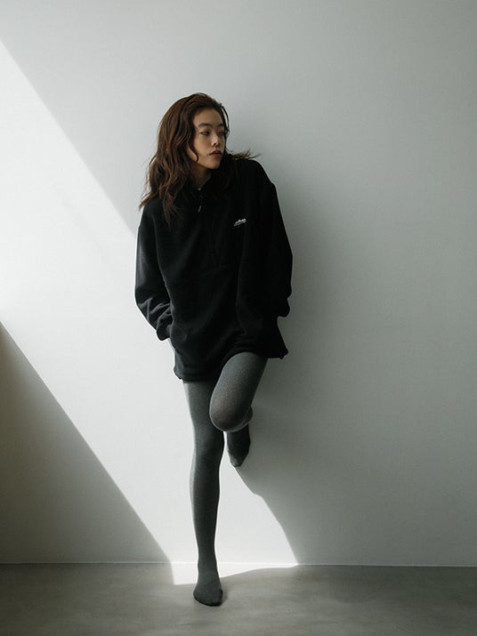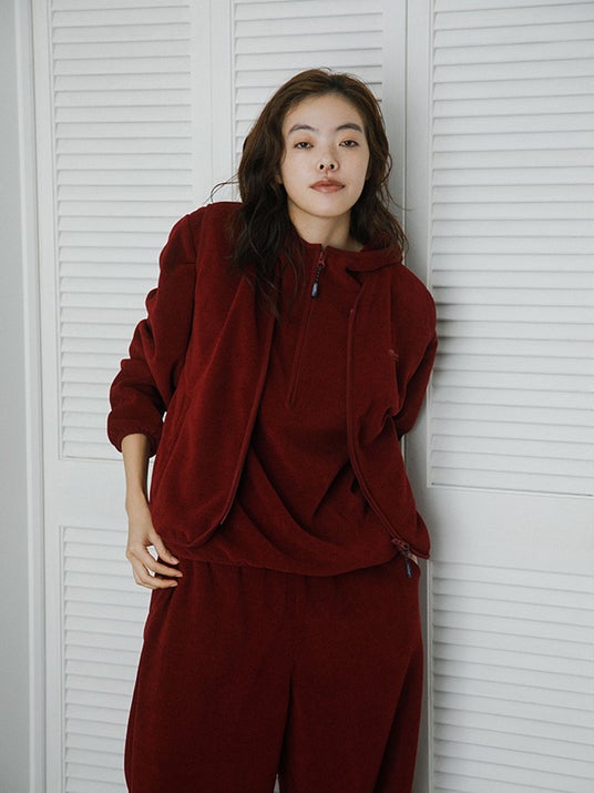 ハーフジップは一枚着でもレイヤードでも楽しむことのでき、同素材のパンツと合わせたセットアップスタイルもおすすめ。