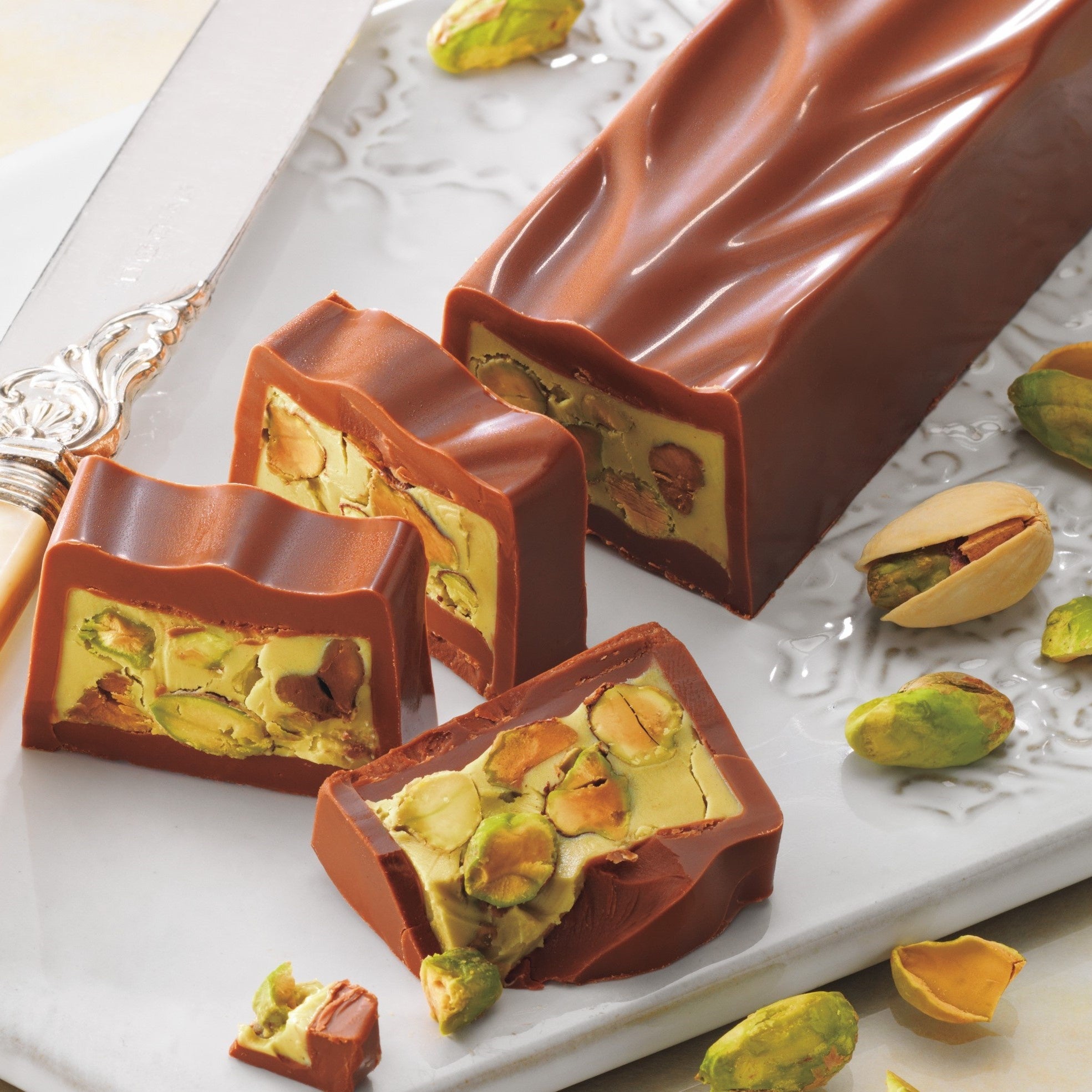 香ばしくコク豊かなピスタチオクリームに、深煎りしたピスタチオと塩がけしたピスタチオの2種類を混ぜ込んで、まろやかなミルクチョコレートに閉じ込めました。 好きな厚さに切り分けて食べるスタイルが楽しいチョコレートです。