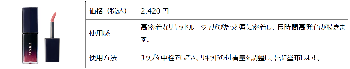 しっかり発色しつつ、肌なじみも抜群なローズカラーで、いきいきとした表情を引き出すリキッドルージュ。透明感のあるセミマットな粘膜色で、くすみレスの唇に仕上げます。みずみずしくのび、ぴたっと唇に密着するリキッド状のテクスチャーです。