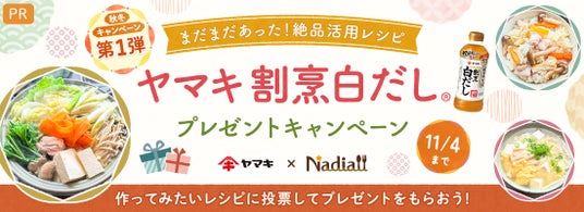 Nadia株式会社(東京都港区/代表取締役社長 葛城嘉紀 以下「Nadia」)とヤマキ株式会社(愛媛県伊予市/代表取締役社長 城戸 善浩 以下「ヤマキ」)がタイアップし、「ヤマキ 割烹白だし(R)」の認知・消費拡大を目的に、レシピ投票キャンペーンを実施いたします。