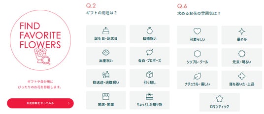 本機能では、最大7つの質問に答えるだけで、自分用・ギフト用のいずれにもぴったりのお花を提案します。