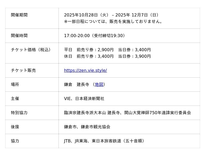 VIE株式会社(神奈川県鎌倉市、代表取締役社長:今村 泰彦、以下VIE(ヴィー))は、日本経済新聞社(東京都千代田区、代表取締役社長:長谷部 剛、以下日経)と共催で開催する夜間拝観イベント「ZEN NIGHT WALK KAMAKURA」(開催期間:10月28日(火)~12月7日(日))において、東海旅客鉄道株式会社(愛知県名古屋市、代表取締役社長:丹羽俊介、以下JR東海)の「#東京ゾクゾク」キャンペーンと連携し、エクスプレス予約・スマートEX会員限定の「特別観覧席プラン」を販売します。