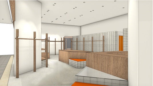 またブロックを積み上げた段状の什器を配置し、空間にリズムを生み出し、ブロックや木材など異なる素材を組み合わせミニマムでクリーンなA.P.C.の世界観を表現しています。