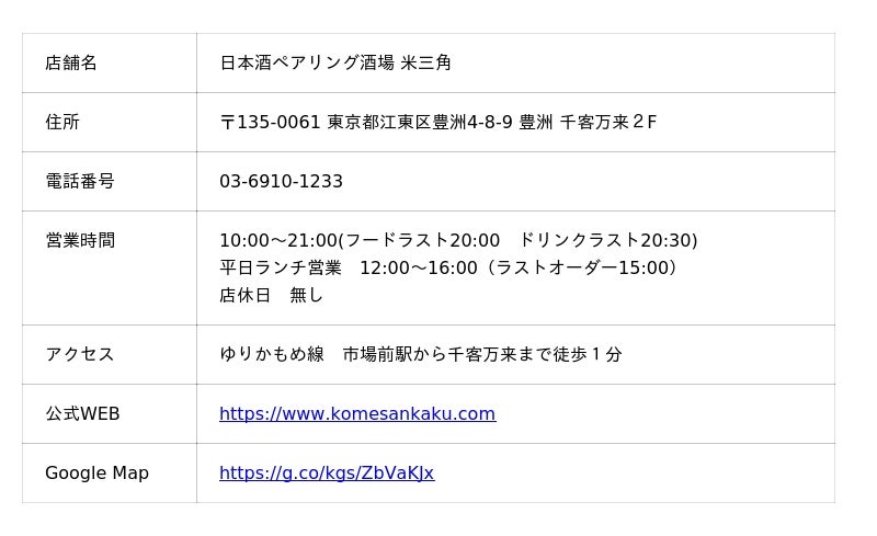 SAKEペアリング酒場「米三角」豊洲 千客万来2F