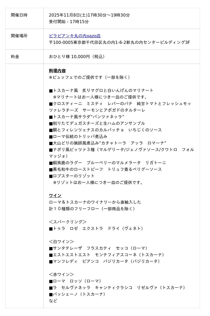株式会社ダイナック(本社:東京都港区、代表取締役社長:秋山武史)が運営する『ビラビアンキ丸の内oazo店』は、イタリア食材輸入専門のモンテ物産株式会社(本社:東京都渋谷区 代表取締役社長:森本明子)の協力のもと、「フィレンツェ」「ローマ」イタリア2大都市の郷土料理とワインのペアリングを愉しむ一夜限りのイベントを11月8日(土)に開催いたします。