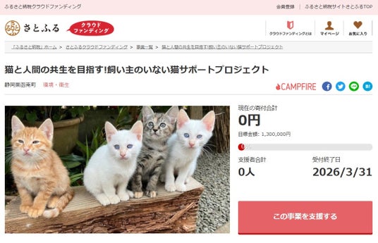 静岡県函南町とふるさと納税ポータルサイト「さとふる」を運営する株式会社さとふる(本社:東京都中央区、代表取締役社長 兼 CEO:藤井 宏明)は、「さとふるクラウドファンディング」にて、「猫と人間の共生を目指す!飼い主のいない猫サポートプロジェクト」の寄付受け付けを2025年10月15日より開始します。
