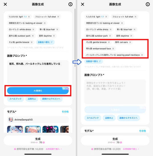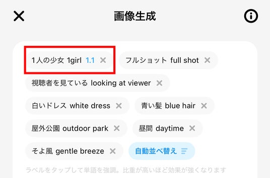 不要なタグはワンタップで削除でき、新しい要素を追加したい場合は文章を追記して再度最適化すれば、新しいタグが既存リストの末尾に追加されます。これにより、初心者の方でも手軽に、そして上級者の方はより細かく理想の構図や雰囲気を反映した画像を生成できるようになりました。