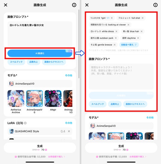 従来の画像生成では、専門的なタグや複雑な構文を理解・入力する必要があり、初心者には難易度が高いという課題がありました。今回追加された「プロンプトAI最適化」では、以下のような体験が可能です: