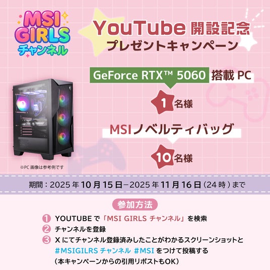 そして、チャンネル開設を記念して、2025年10月15日(水)~11月16日(日)の期間中、「MSI GIRLSチャンネル開設記念キャンペーン」を実施いたします。キャンペーンにご参加いただいたお客様の中から、抽選で1名様にGeForce RTX(TM) 5060搭載ゲーミングPCを 1台、さらに、10名のお客様にMSIオリジナルノベルティバッグをプレゼントいたします。