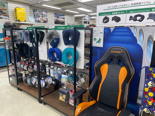 ネックピローコーナーでは各商品のサンプルを完備。飛行機や新幹線をイメージした背もたれ付き椅子で実際に使用感をお試しいただけます。しっかり支える低反発ウレタンタイプ、コンパクトに持ち運べるエアタイプなど、お気に入りのネックピローに出会えるはず。