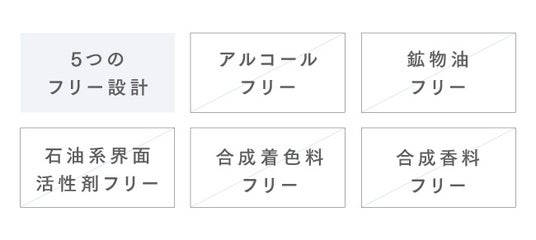 肌の負担となりうる成分をできる限り使用せず、天然由来成分を中心に作りました。5つのフリー処方(アルコール、鉱物油、石油系界面活性剤、合成着色料、合成香料を不使用)