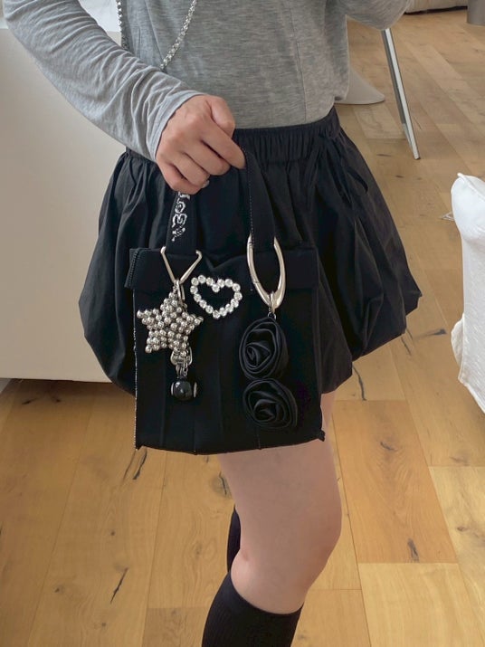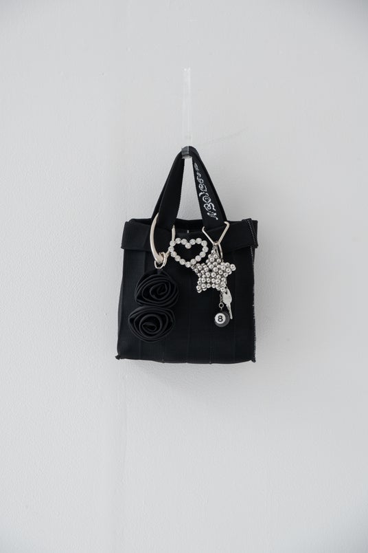 もう一つのブラックの「Co-Knitty」作品は、シルバーを基調にした星形や鍵のモチーフのキーホルダーをあしらった、個性的で存在感あふれるデザインが特徴です。ショルダーに入ったロゴもワンポイントに。