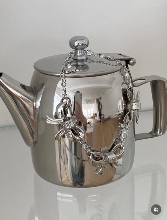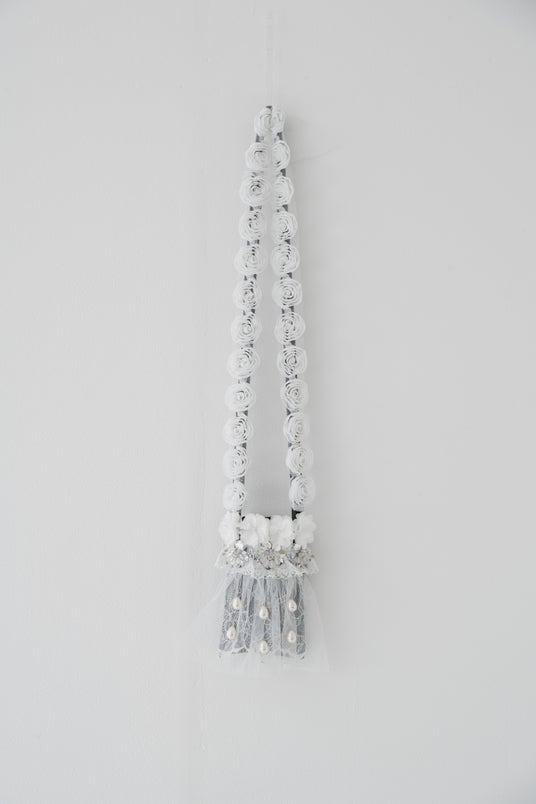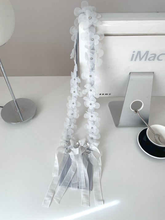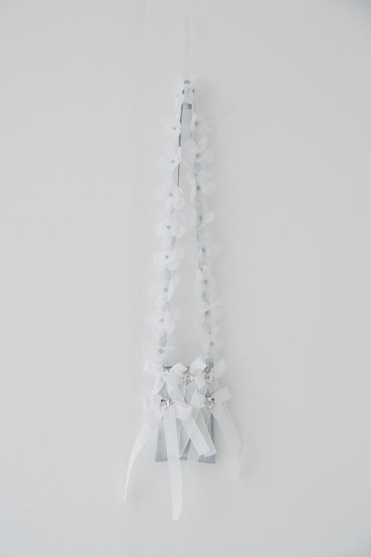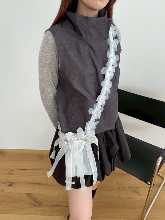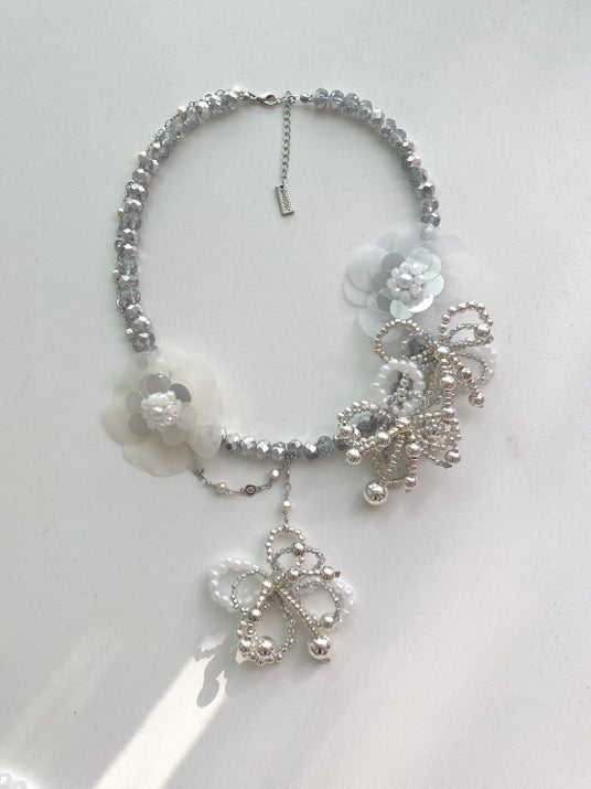 グレーの「Me-Knitty」をベースにした作品は、結び目に施された立体的なお花のビジューが特徴的な5つのリボンが印象的なデザインです。