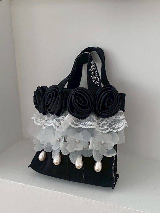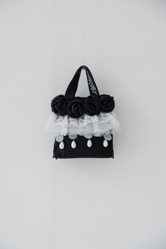 ブラックの「Me-Knitty」をベースにしたこちらの作品は、チュール素材のお花や、ドレスの裾のようにひらひらと舞うレース生地が華やかにあしらわれたデザインが魅力です。