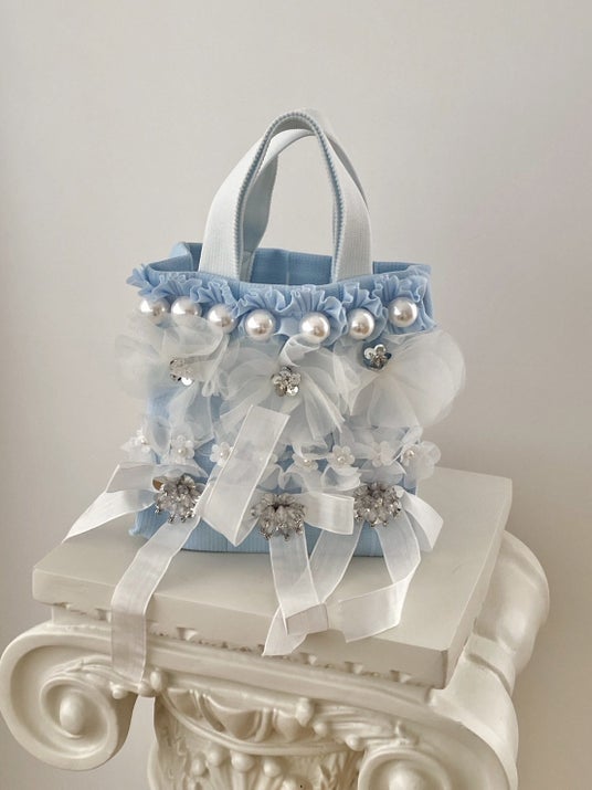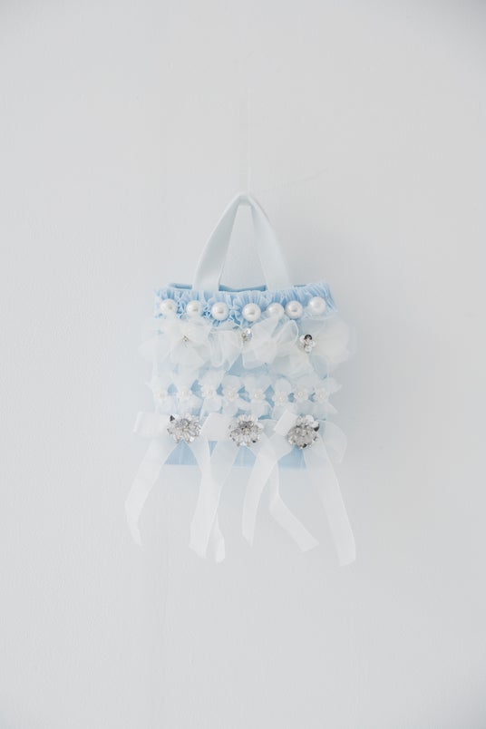 ライトブルーの「Co-Knitty」に、リボンやパール、チュールで作られた立体的なお花などを贅沢にあしらった、特別感あふれる作品です。