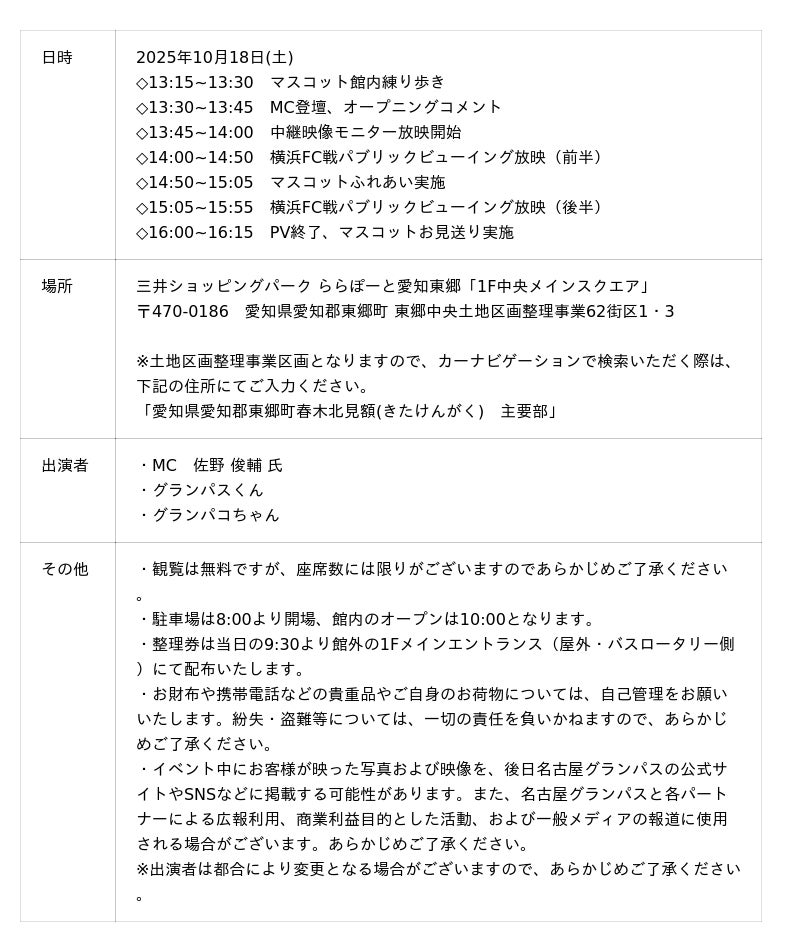 標記の件、10月18日(土)に開催される明治安田J1リーグ第34節 横浜FC戦のパブリックビューイングをクラブパートナーである「三井ショッピングパーク ららぽーと愛知東郷」にて実施することが決定しました。