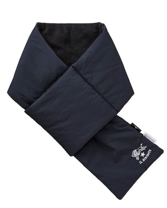 バイソンロゴ刺繍が存在感を放つマフラーは、表地に軽量のタスランナイロンを使用。WINDSTOPPER(R) プロダクト by GORE-TEX LABSの裏地、中綿、保温設計のリフレクションギア、吸湿発熱素材のブレスサーモを組み合わせ、防風・保温機能性を実現しています。